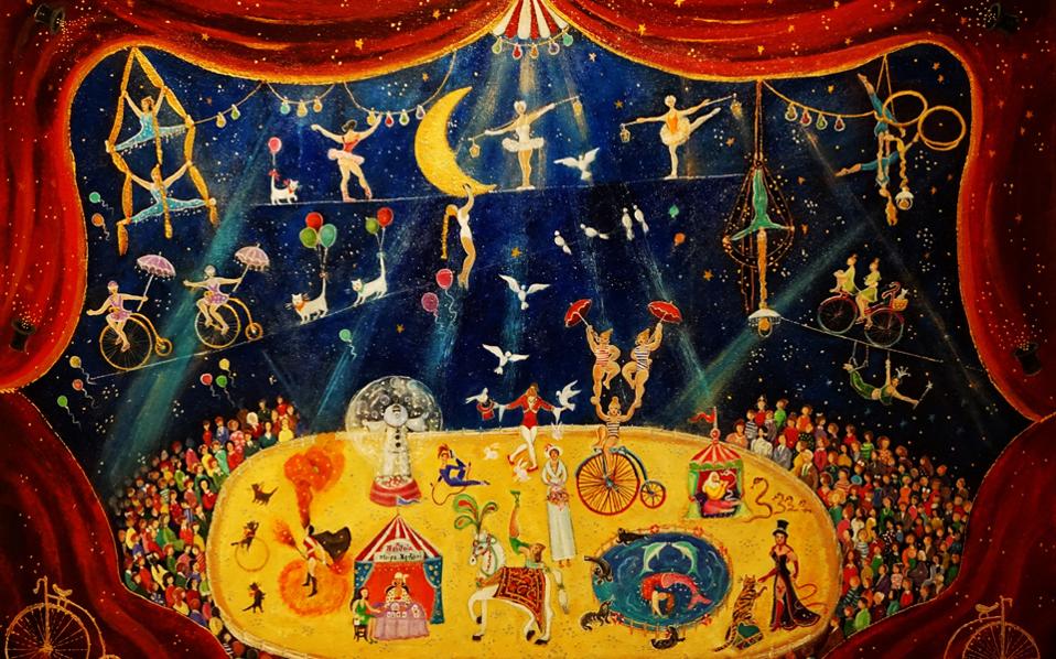«Το τσίρκο». Εργο της σύγχρονης ναΐφ ζωγράφου Ρούλης Μπούα. Από την έκθεση της Συλλογής Κολλιαλή στο Ιστορικό Αρχείο - Μουσείο Υδρας.
