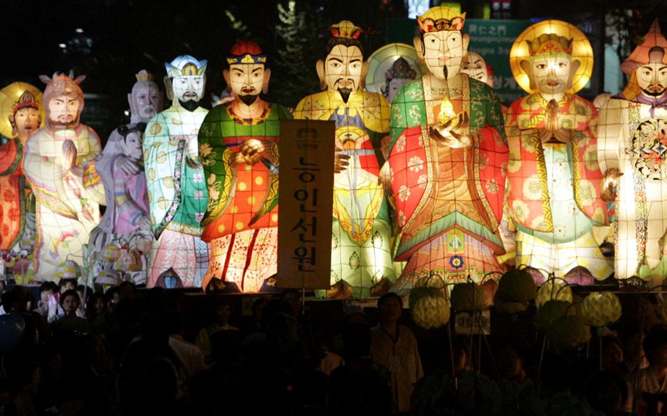Βουδιστές στη Νότιο Κορέα μεταφέρουν τεράστια φανάρια με μορφές του Βουδισμού σε παρέλαση στη Σεούλ, στο πλαίσιο του Φεστιβάλ Φαναριών.